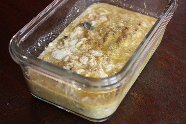 Discard the shell if you don't want the tomalley (liver) and fat, which some call the viscera. Otherwise, pour out the liquid inside the shell, stopping short of the more solid, thickish contents, which is the greenish gold tomalley and white fat. It may look like the contents of a poopy diaper, but it's crab gold to those who love it. If you're fond of the stuff like I am, use a teaspoon to scrape the tomalley and fat (below) into a small container and discard the empty shell.