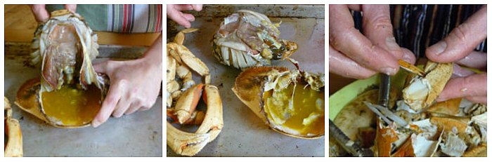 Use your hands to snap the body in half. Use your fingers to remove the meat from all the little channels, depositing it in another bowl. Then crack and remove the meat from the claws and legs, adding it to the bowl. A metal nutcracker is handy for cracking, and the pointy tip of a crab leg is perfect for digging out the meat.