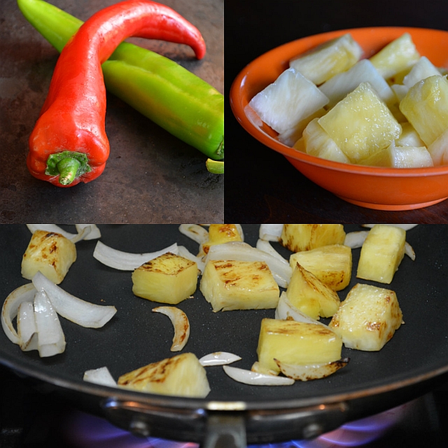 pineapple. Fry for about 2 minutes, stirring and flipping, until the pineapple picks up some dark brown streaks. Add the ginger and pepper. Cook, stirring constantly, for 1 minute, until the peppers are crisp tender. - Add the tomato and pour in the sauce. Cook, stirring, for 30 to 45 seconds, until the sauce bubbles and thickens. Add the pork and stir to combine and coat. Transfer to a serving plate, garnish with the green onion and enjoy with lots of rice.