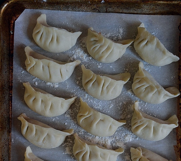 I decide to make a classic pot sticker. I filled homemade wrappers with a pork and napa cabbage mixture (see page 31 of Asian Dumplings). Then I shaped them as pleated crescents.