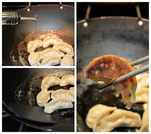 The wok was on my biggest burner and soon, there was no liquid left. Smoke began coming up, and I took the wok off the heat. I poked and the dumplings wouldn't budge. I drizzled in oil, then replaced the wok on the burner over medium heat. No lid used this time.