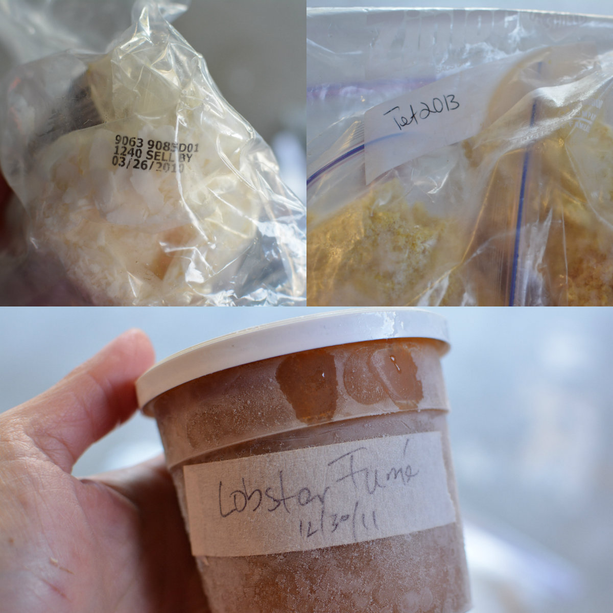 The situation in my freezer is not quite like that of my mother's. To be honest, I found some shamefully old things in mine -- food that I thought I should eat and would keep, but I never did. For example, lobster fumé from 2011. I used to save the shells from cooking lobsters because they were so pricey, and made the broth for special event lobster risotto. I thought I was being frugal but not using it killed that ambition.