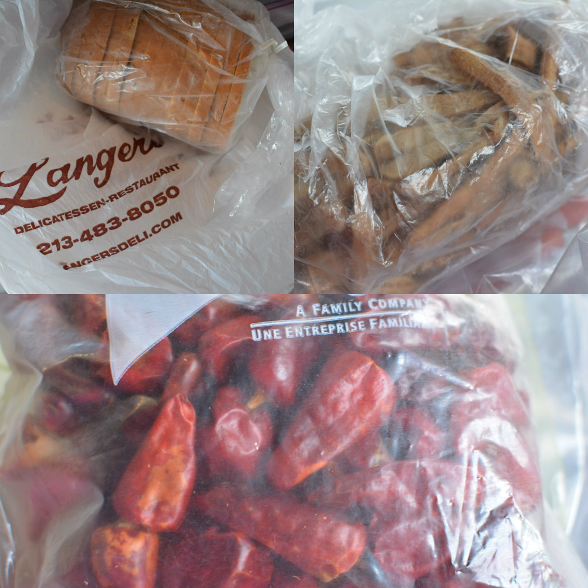 Spring roll wrappers, freezer burned scallops, ancient looking bags of soy milk lees (okara) were part of the twenty or so pounds of trash that I dumped into the garbage. Some items, however, I couldn't part with. Precious keepers included dried lantern chiles that Karen Shinto and I carried back from Sichuan, bags of natural yellow and purple food dyes that Elizabeth Andoh insisted I buy in Tokyo, dried sa sung worms that Cameron Stauch brought from Hanoi, and rye bread from Langer's in Los Angeles.