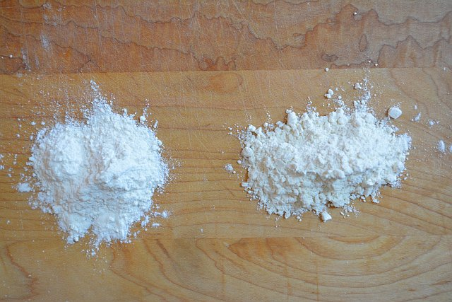 Texturally, the special dumpling flour was strange. I didn't expect the Chinese dumpling flour to look different than the Gold Medal. When I scooped it out of the bag, it was powdery and fine almost like rice flour. The Gold Medal felt and looked more fluffy. It fell onto my cutting board with little clumps in the mound.