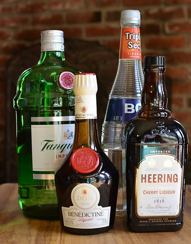 Instead of Cointreau, we used triple sec because we had it in the house already. There's little involved so it's negligible. As for the gin, we keep several, but high-octane Tanqueray balanced out the other intense liquors well. Cherry Heering and Dom Benedictine are sold at well-stocked liquor stores and markets. If you don't want to buy the big bottles, try finding the little ones. But why not stock up and impress your friends?