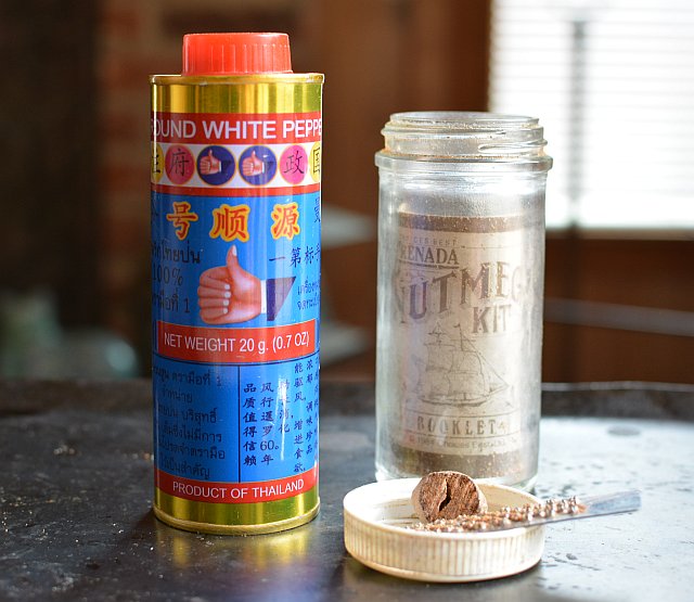 Spice-wise, I reached for cinnamon (cassia) I bought in Vietnam, grated nutmeg by hand, and measured out Thai white pepper that Pim Techamuanvivit gifted me (the distinctive container holds chopsticks for eating noodle dishes at Pim's new restaurant Kin Khao). You don't have to go to such lengths but I had those particular ingredients on hand.
