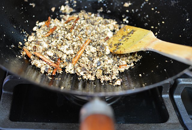 - Soak the mushroom in water to rehydrate. Stem and then finely chop. Put into a small bowl and add the crumbled tofu. Season with 2 teaspoons regular soy sauce and ½ teaspoon dark soy sauce. Set aside.
