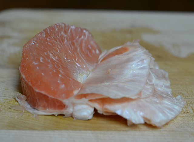 The hardest part of making an Asian pomelo salad is removing the segments. However, Big Boy gave me little trouble. The flesh peeled off the skin with ease and it even separated into discreet tear-drop pieces and chunks without much hassle from my fingertips. When it comes to selecting fruit, it pays to listen to the farmer.