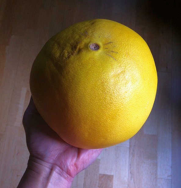 About a month ago, I bought a giant pomelo at our local farmer's market. It's always challenging for me because who knows how much actual flesh is inside. I'd tasted his samples and decided to buy one. "Pick a heavy one," he advised. I must have spent 5 minutes picking through his bins before settling on one the size of a volleyball. I paid about five dollars.