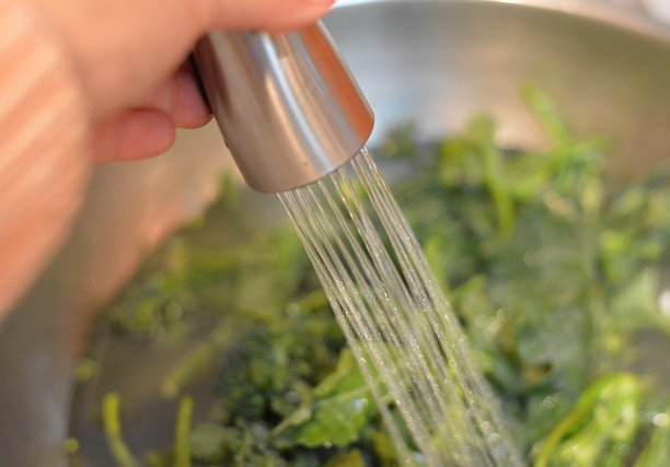 Spray versus stream of water. At a home builders convention in February, I asked a Kohler representative about whether the spray nozzle on the kitchen faucet used less water than the stream of water. The water flowed at the same rate so she wasn't sure. I somehow think that you use less water with the spray as it seems to knock stuff off dirty dishes quickly. What do you think? I'm not about to put an aerator on my kitchen faucet to save water but I will use the spray more often.