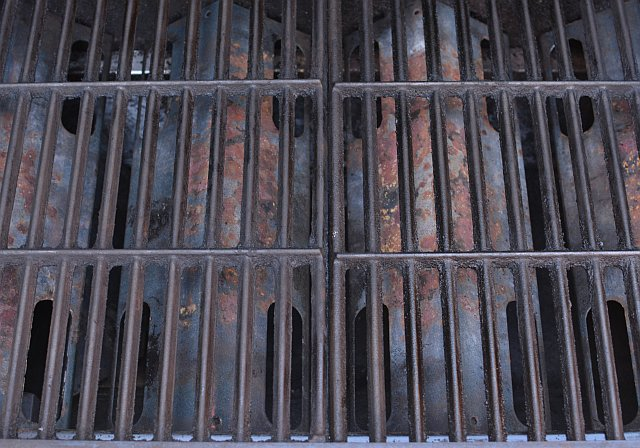 I went at the inside of the grill with the brush again, spraying on some of the cleaning liquid to loosen things up. Then I did the really really yucky part of the job - I took the flavorizer bars and grates into the kitchen sink and cleaned them. I didn't aim to get them super clean, just so that I could make out the clean contours of their edges was good enough.