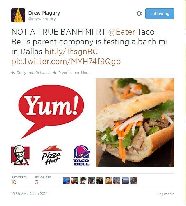 Yesterday, Mike Hiller of EscapeHatch Dallas reported that Yum! was indeed going to launch a Banh Shop location in Dallas. (Houston and Dallas have large Vietnamese communities but Yum! isn't targeting just Viet people.) His piece revealed that the prototype would be in a former auto repair shop "near the intersection of SMU Boulevard and Prentice Street, just east of I-75". Khushbu Shah at Eater picked up on the news as did journalist and satirist Drew Magary, who tweeted this: