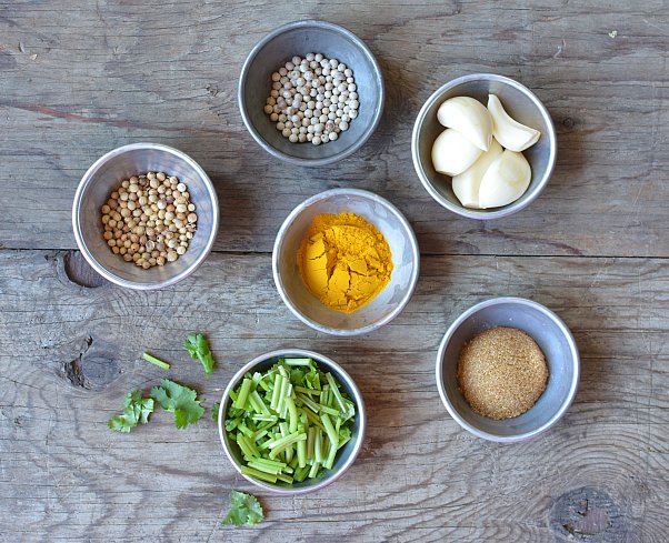 - Grind the peppercorns and coriander seeds in a small food processor to a coarse texture. Add the sugar to grind it a little finer. Visible bits remaining are okay. Add the turmeric, garlic, cilantro, fish sauce, and oyster sauce. Process into a relatively smooth marinade.