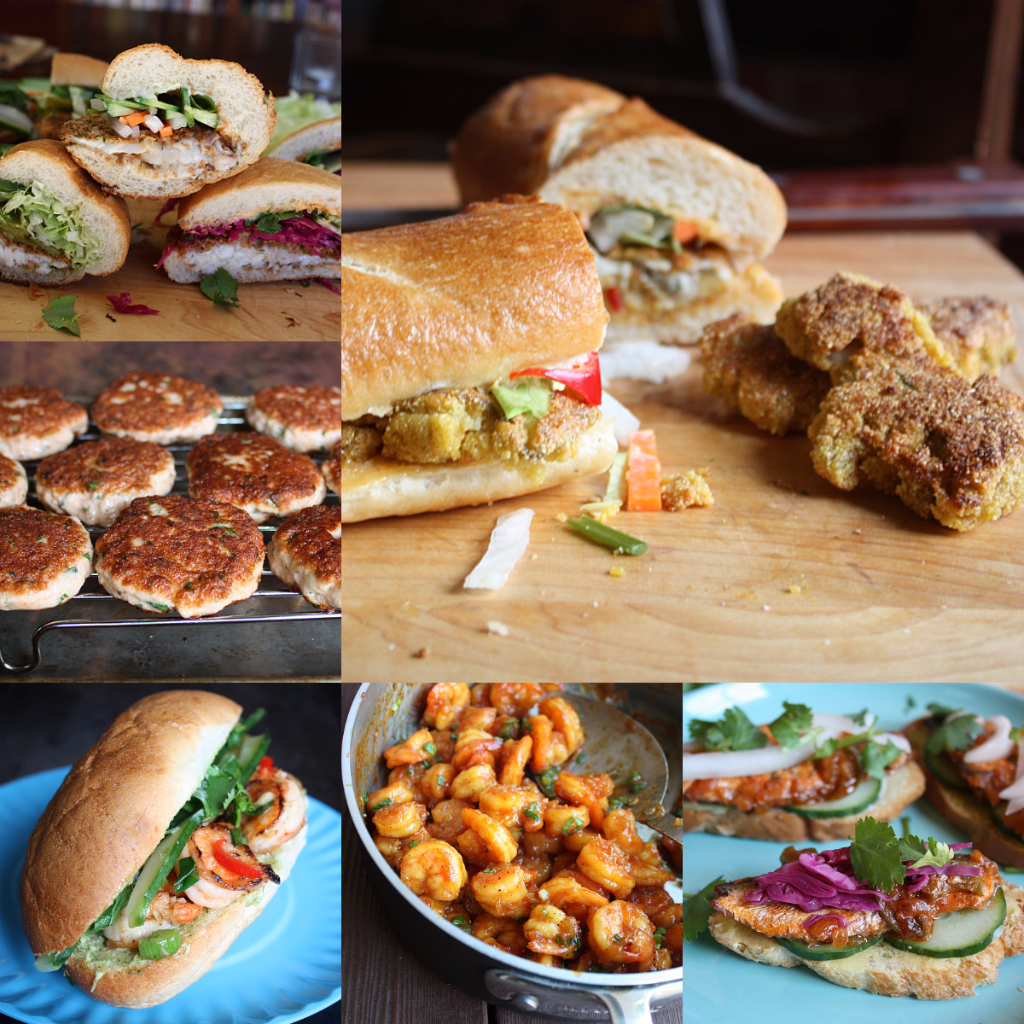 There's a cross-section of three fishwich banh mi, the salmon herb patties cooling, wok-seared shrimp banh mi, shrimp, in caramel sauce, and sardine and tomato sauce atop crostini. The Viet oyster po' boy banh mi was fun to make and even better to eat. I tried a lot of kinds of presentations and breads while writing the book.