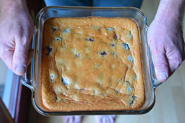 Everything went swimmingly well. Our friend Jeff came over and I posed him holding the finished cake. Then our friends Katy and Stephen invited us for a drink and we went. When we returned home, the cake was cold and I wanted to properly warm it up. I put the clafoutis in the toaster oven at 300F and sat down to dinner. We'd had a bottle of wine or so before I remembered the warming clafoutis.