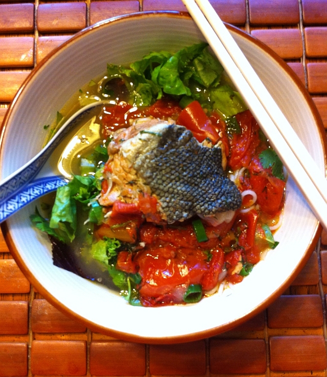 Toss in the fish head too, my dad suggests for people who like to nibble and gnaw on fish cartilage. Then serve the soup in a tureen with bun round rice noodles, ribbons of Romaine lettuce and lots of chopped herbs. Let people make their own bowls.
