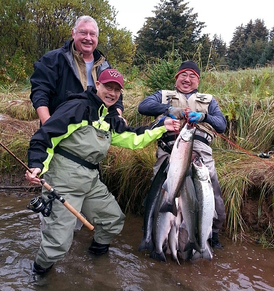 My brother Dan had caught them on a fishing trip in Alaska. I'd seen a Facebook photo of Dan holding one of the salmon and wondered what he was going to do with it. I never thought he'd catch seven total. Bo Gia told me that Dan also caught a 160-pound halibut. Glad he didn't send that to my mom because it must have been the size of a bathtub. After Dan read this post, he emailed a location shot of himself holding onto his haul. He sent some of these to my mom...