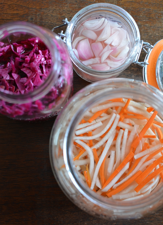Given my past observations and experimentation, I made a pot roast of sorts but cut the beef into big chunks. The result was tasty. My husband said the meat made a good beef sandwich with pho flavors. We tried it with three pickles I had in the house -- daikon and carrot pickle, citrusy red cabbage pickle and pickled shallot (Banh Mi Handbook, pages 33, 34, and 36); I tucked the shallot in with the other two pickles for a little oniony bite. The slaw-like quality of the red cabbage paired nicely with the beef.