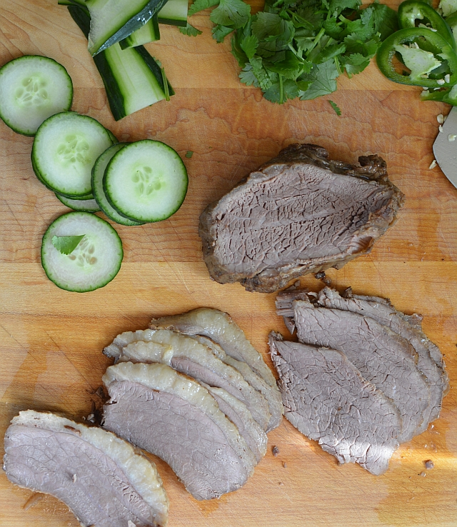 - To use for banh mi: Thinly slice the beef across the grain. Replace the beef in the warm cooking liquid to soak up flavors, then layer it into your sandwich. Try using the cooking liquid instead of Maggi to flavor the bread after you lay down the mayo. Any of the pickles work. Mint with or without cilantro help the pho flavors pop.