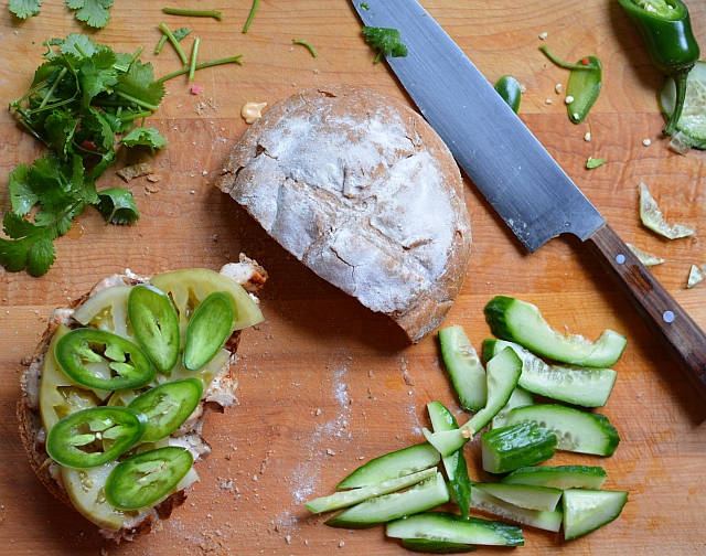 A new idea I came up with is the banh mi wedge. Use a medium or large round loaf of bread instead of a roll or baguette. We bought a medium size sheepherder's loaf and after my husband used some to eat with pate, I looked at the loaf and realized that its light crumb and crisp crust would be great for banh mi. Since few people could get their mouth around an 8-inch (20-cm) wide sandwich, my thought was to cut it in to wedges.
