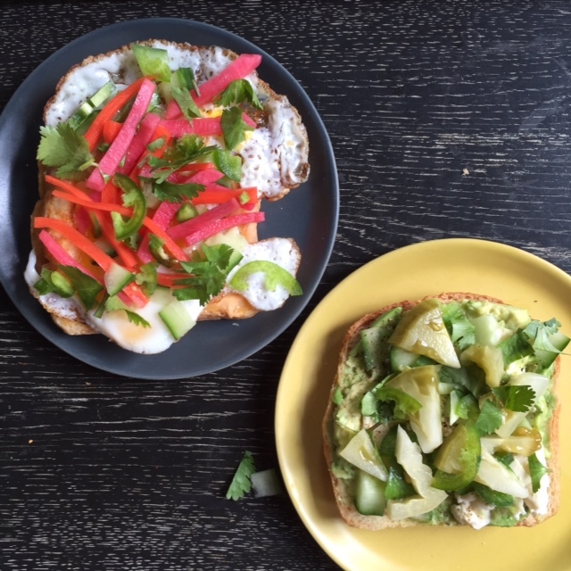 The green banh mi toast was comprised of: mashed avocado, smeared Laughing cow cheese, black pepper, English cucumber, jalapeno, cilantro and green tomato and lemongrass pickle.