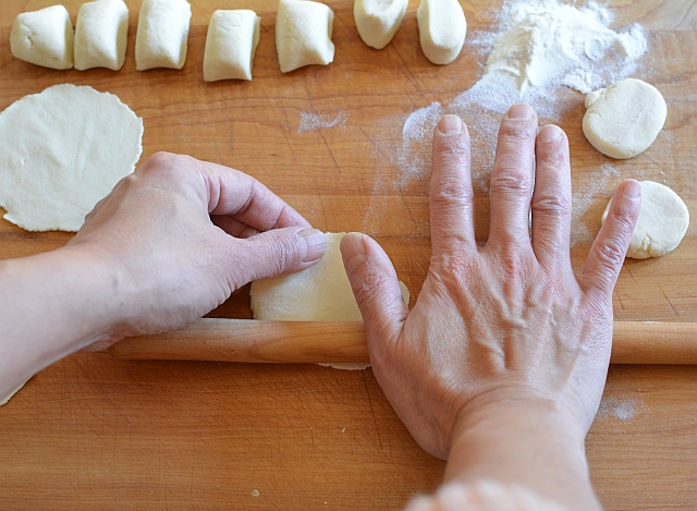 - To form dumplings, work with a quarter or half of the dough at a time, keeping the unused portion covered to avoid drying. Roll it into a rope, about 1-inch thick. Cut crosswise into 8 (if using a quarter of the total amount) or 16 (for half of the total amount).
