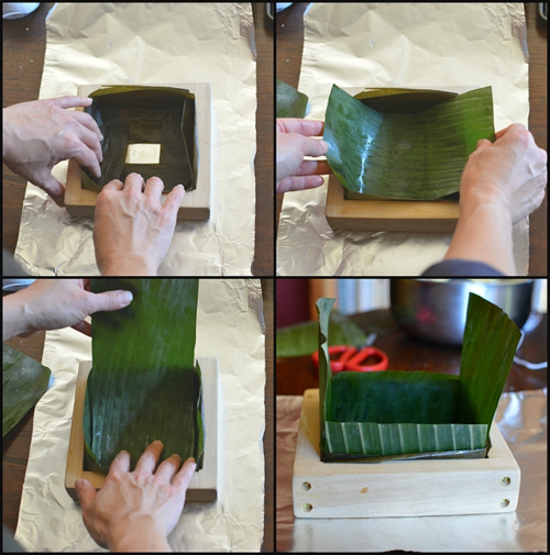 2) Add banana leaves. Line the mold with 3 banana leaves -- first crosswise, then lengthwise.