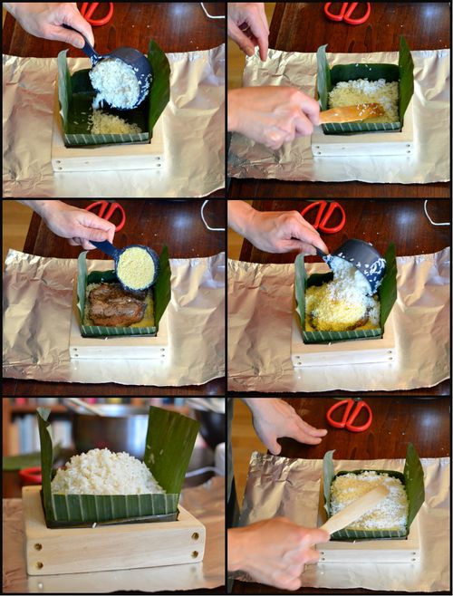 Get organized. I work at my dining room table to cut and trim the banana and bamboo leaves to fit the mold. All the ingredients have been prepped and are ready to assemble.