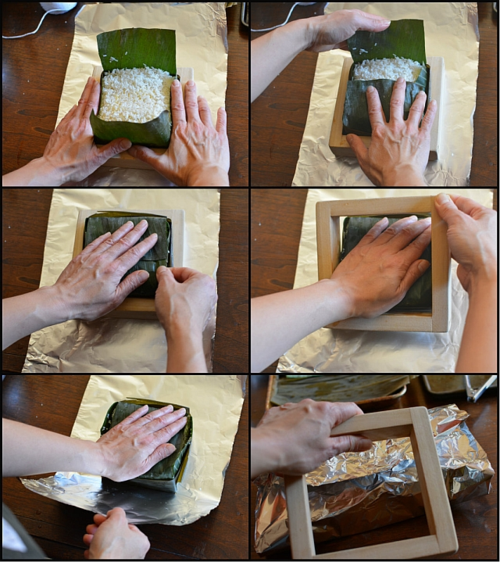4) Close up the banh chung. Sides first, then bottom and top. Now, hold down the cake to keep it in place as you remove the mold. Let the mold sit on your arm until you fold the foil over the cake to keep the banh chung in place. At that point, take the mold off - it's like a ginormous wood bracelet.