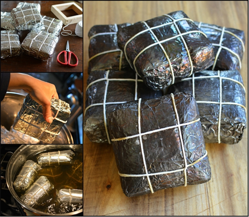 5) Fold up the foil as if you're wrapping a gift. Tie the banh chung with kitchen string. Repeat with all the cakes. (I made 1.5 batches this year so I made 6 of them.) The long boiling is about 7 hours long. I had a 20-quart pot so they all stood in the water and cooked quite nicely without me having to rotate them too much, or to refill with water.
