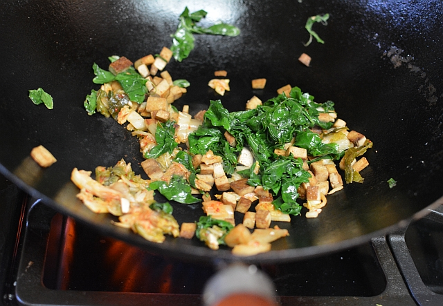 - Heat the wok over medium heat. Add the tofu and drizzle in some Maggi - about 2 teaspoons, or to taste. Stir and let sizzle until the liquid has been absorbed. Raise the heat, add the garlic, greens and kimchi. Stir to wilt slightly. Bank the mixture to the side.