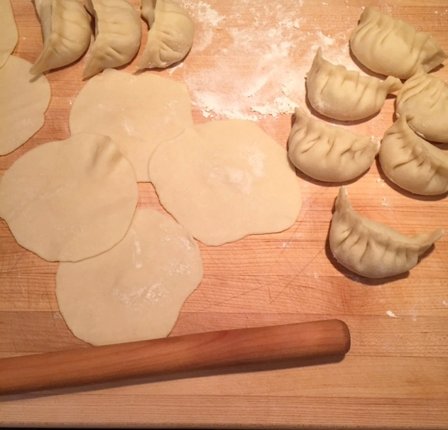 I like to make dumplings in batches -- say 8 or 16 at a time. That's ¼ or ½ of a batch of the basic dumpling dough. It depends on how comfortable you are with rolling out wrappers. If you're working alone and are new to it, work in smaller batches. If friends are around to help, go with half batch. It also depends on the dough. Some days, if it's super moist, it may benefit from airing out a bit.