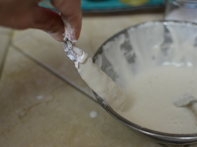 - Meanwhile, add the baking soda and baking powder to the flour mixture. Stir in the ice water by the tablespoon to create a thick, silky batter resembling pancake batter. You may need about ½ cup, depending on how much flour was leftover after coating the shrimp. Add a little bit extra starch, rice flour and all-purpose if you want to hedge your bets. Regardless, the batter will thickens and form little gas bubbles as it rests.