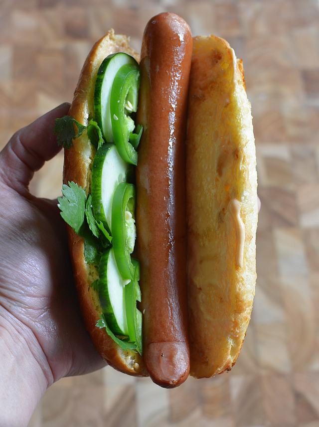 "The hot dog bun doesn't taste good with this," my husband Rory said. I totally agreed. The traditional soft hot dog roll lacked the crispness to stand up to all the pickles and vegetable garnishes. I heated the brioche hot dog bun like I did with the banh mi roll but that didn't do much for crisping the bun. At the end of the day, we ate up the banh mi hot dogs made with banh mi rolls and picked at the other ones.