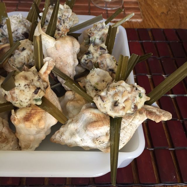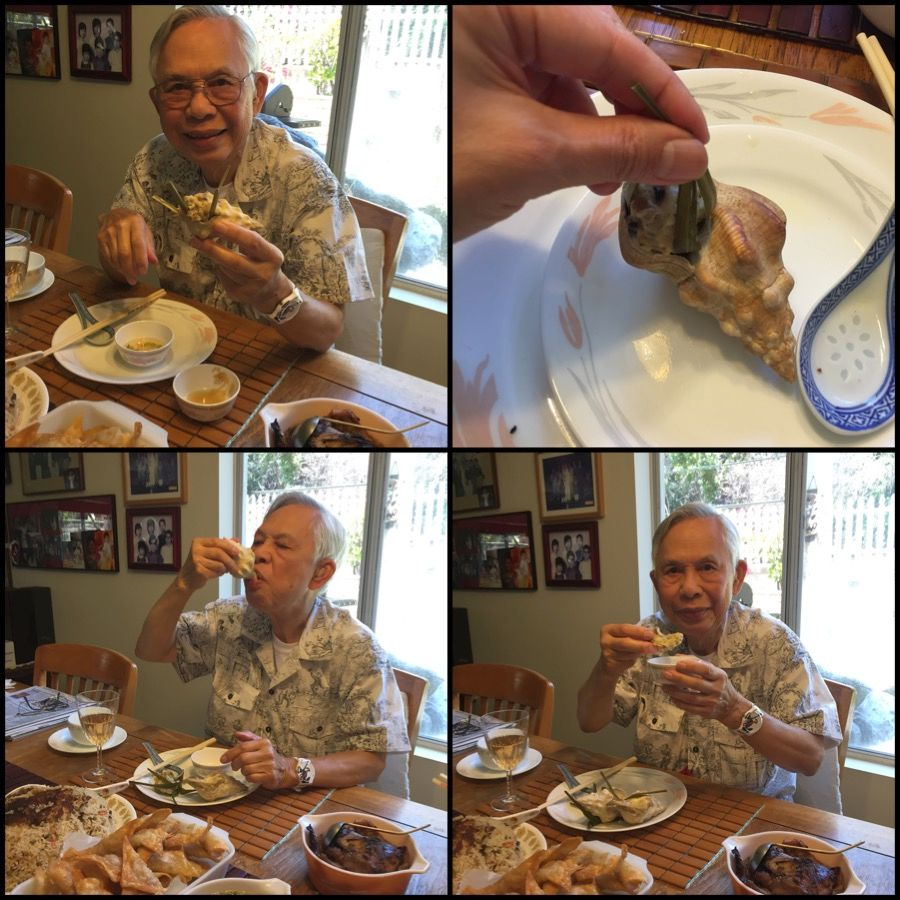 That wonton VWK story mentioned several people who stepped up to help us out resettle in America. After reading the post, my parents were inspired to make oc nhoi, stuffed periwinkle served with a ginger lime dipping sauce. She followed the recipe from Into the Vietnamese Kitchen. The stuffing is held in the shell with two blades of lemongrass, which as you know, my parents relish for flavor and health. That dish, my dad recalled during lunch to Rory, was beloved by two American friends who helped my oldest sister get situated at USC where she and the rest of us went to college. "Mr. Pat O'Donell held an empty shell to his ear and claimed he could hear the ocean. Then he asked if there were more to eat," Bo Gia recounted.