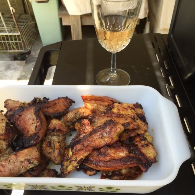 "I had the pork belly in the freezer and found a recipe in Lam Bep Gioi [one of her and my favorite Vietnamese cookbooks] for faking grilled dog," she proudly said. I volunteered to go outside to grill. My dad poured me a glass of wine.
