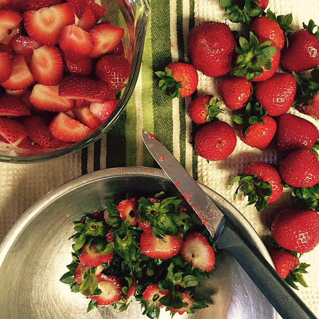 - 2 pounds (950 g) strawberries, hulled and cut into pieces the size of cherries (6 cups / 1.4 l total)