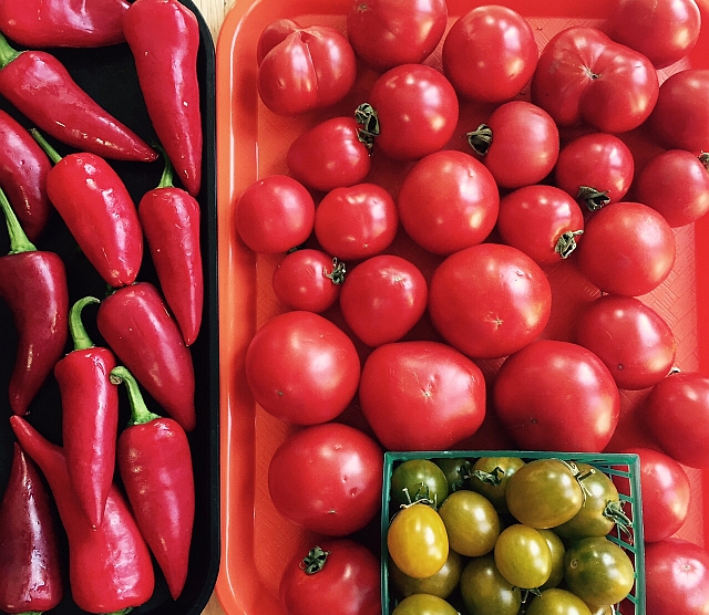 Our farmer's markets are flushed with ripe peppers these days. I'm not talking regular bell peppers, but Hatch, Jimmy Nardello, Fresno, Jalapenos, Serranos, Thai, Pasilla, Shishito, Padron, and rarities such as Espelette. Tomatoes - from crazy looking heirlooms to candy-like dry-farmed fruits, are being sold by many local farms.