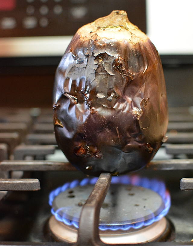 - Over medium-high heat, grill the eggplants directly on the stove's grates for about 20 minutes, rotating occasionally for even cooking. Aim to char all over. Regulate the heat as needed to achieve a smokiness and cook thoroughly. The eggplants will collapse and feel somewhat soft all over; if they aren't cooked through after peeling, you can microwave them. (You can do this on a charcoal or gas-powered grill too. Or broil 3 to 4 inches (7.5 to 10 cm) away from the heat source. Try a cast-iron pan on the stovetop if you don't have a gas stove. Cool in bowl.