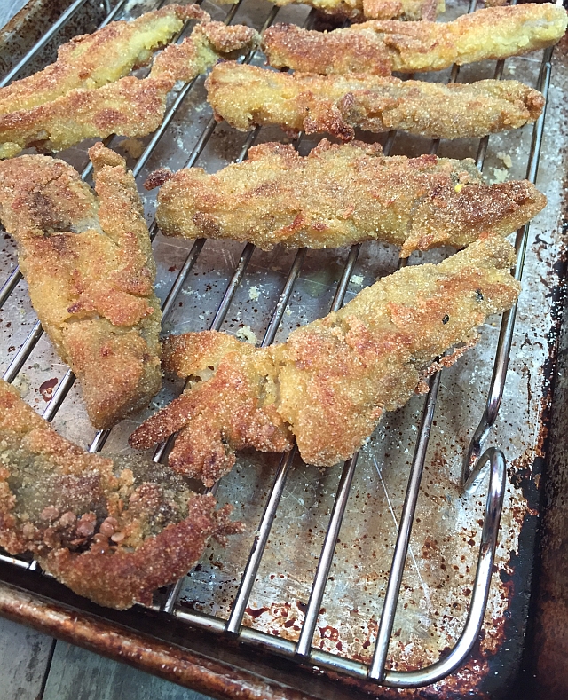 Usually I use cornmeal and corn flour but there was an open bag of semolina flour on the counter. I wondered how the eggplant would fry up coated in the coarse flour made from durum wheat (the same stuff used for pasta). Pretty well, I found out. The fried eggplant pieces were crisp on the outside, browned beautifully, and reheated well. I was hooked.