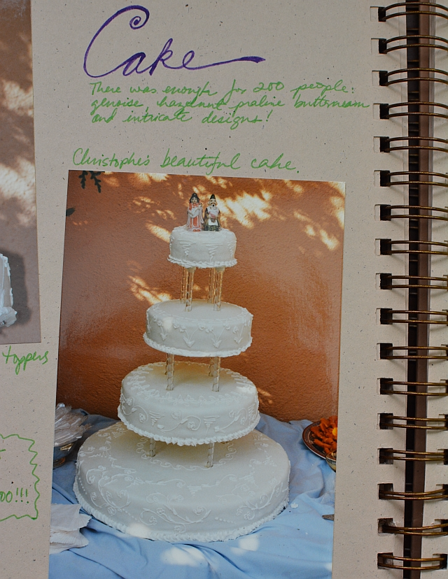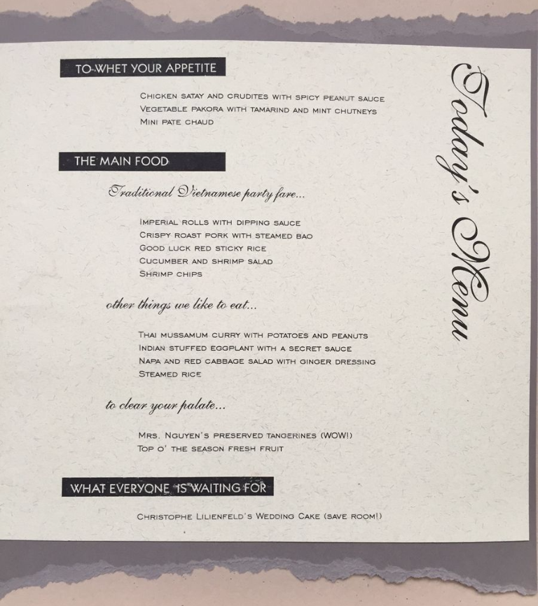 The pakoras and eggplant from a favorite Indian vegetarian restaurant near our apartment. I made the satay, curry, and cabbage salad. I guess I must have made the rice too! The glorious cake (genoise, hazelnut butter cream, and fondant) was prepared by our friend Christophe, a classically-trained French pastry chef. The cake topper was a charming gift from Teresa, a friend residing in Hong Kong; mixed couple wedding toppers were hard to find in 1996.