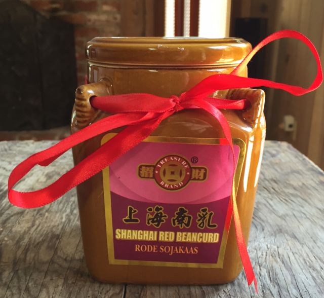 What about when I'm buying an unfamiliar ingredient and have to start out from scratch? When I was working on the Asian Tofu book, I had to figure out fermented tofu. I spent months on a from-scratch recipe and then spent a lot of time shopping for it. One of the best brands of fermented red tofu came in this ceramic container. It was charming with the red ribbon. There was tape sealing the lid. It cost roughly $5, the highest price of all the brands. I saw the brand at several Chinese markets and decided to try it out.