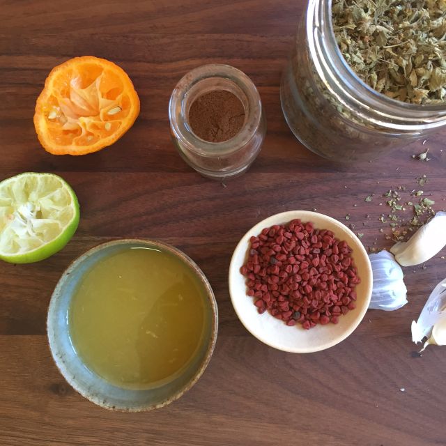 - Use an electric spice grinder or coffee grinder dedicated to grinding spices to render the achiote and oregano into fine texture. Transfer to a bowl and add the allspice, pepper, vinegar, garlic, and salt. Work in 1 to 2 tablespoons of water to make a paste. Then stir in the citrus juice to create a marinade.