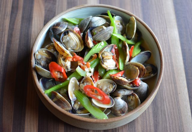 - Heat a large wok or Dutch oven over high heat. Swirl in the oil, then add the garlic, and chile. Stir for about 15 seconds, until fragrant. Add the clams and celery. Stir to combine well and cook for about 2 minutes, until heated through. Add the sauce.