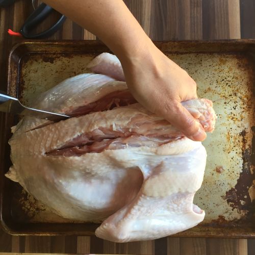 On a turkey, open up the bird and find the dagger-shape keel bone and cartilage in the center of the breast; use a knife tip to score through the membrane along both sides of the bone. This makes flattening the bird easier. I'm scoring a 13-pound turkey below: