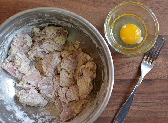 - In a bowl, combine the starch, flour, salt, pepper, and baking soda. Add the egg and stir. Things will look jagged. Add the chicken and mix with your hands or a spatula. Set aside