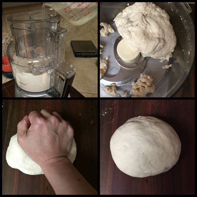 - Start the processor, then pour the liquid mixture in a stream through the feed tube. After a dough ball forms, let the machine run for another 15 to 20 seconds. Transfer the dough and any scraps to your work surface. Knead, adding a light dusting of flour to prevent sticking. The finished dough should feel satiny and smooth. Put into a bowl cover with plastic wrap and let rest for 15 minutes, or as long 2 hours.