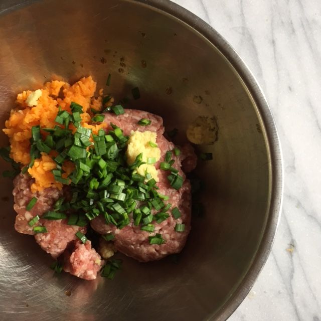 - For the filling, put the squash in a bowl, cover with parchment then microwave for 30 seconds to lightly cook; cool then transfer to a medium bowl. Add the pork, chives, rice wine, ginger, soy sauce, and salt. Stir well with a fork or your hand. Set aside.