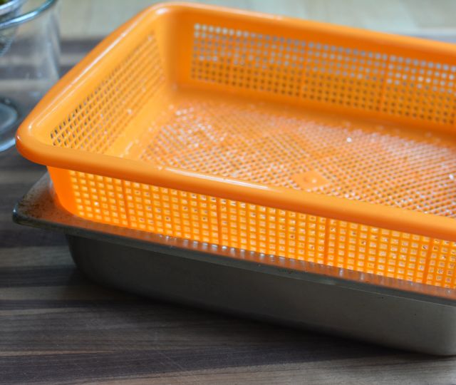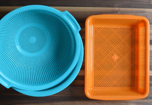 Choose something porous to grow in. My rectangular and round strainers/colander came from an Asian houseware shop (Kamei on Clement in San Francisco) though you can find them at Asian markets too. A metal one like this or this would be fine, too. You want something with a wide flat bottom and holes all around. My plastic orange one had an interior roughly the size of an 8.5 x 11-inch, regular piece of paper. The teal round one is about 14-inches wide at the top. If you can, chose rectangular over round because the sprouts can spread out evenly without crowding.