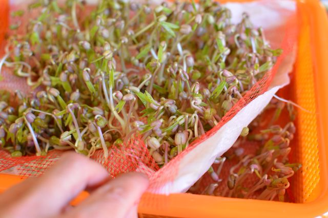 "The green husk usually falls off as you transfer the sprouts. You can cut the tails off with scissors or keep them for an artful, natural look. I kept mine in a recycled plastic produce container. "